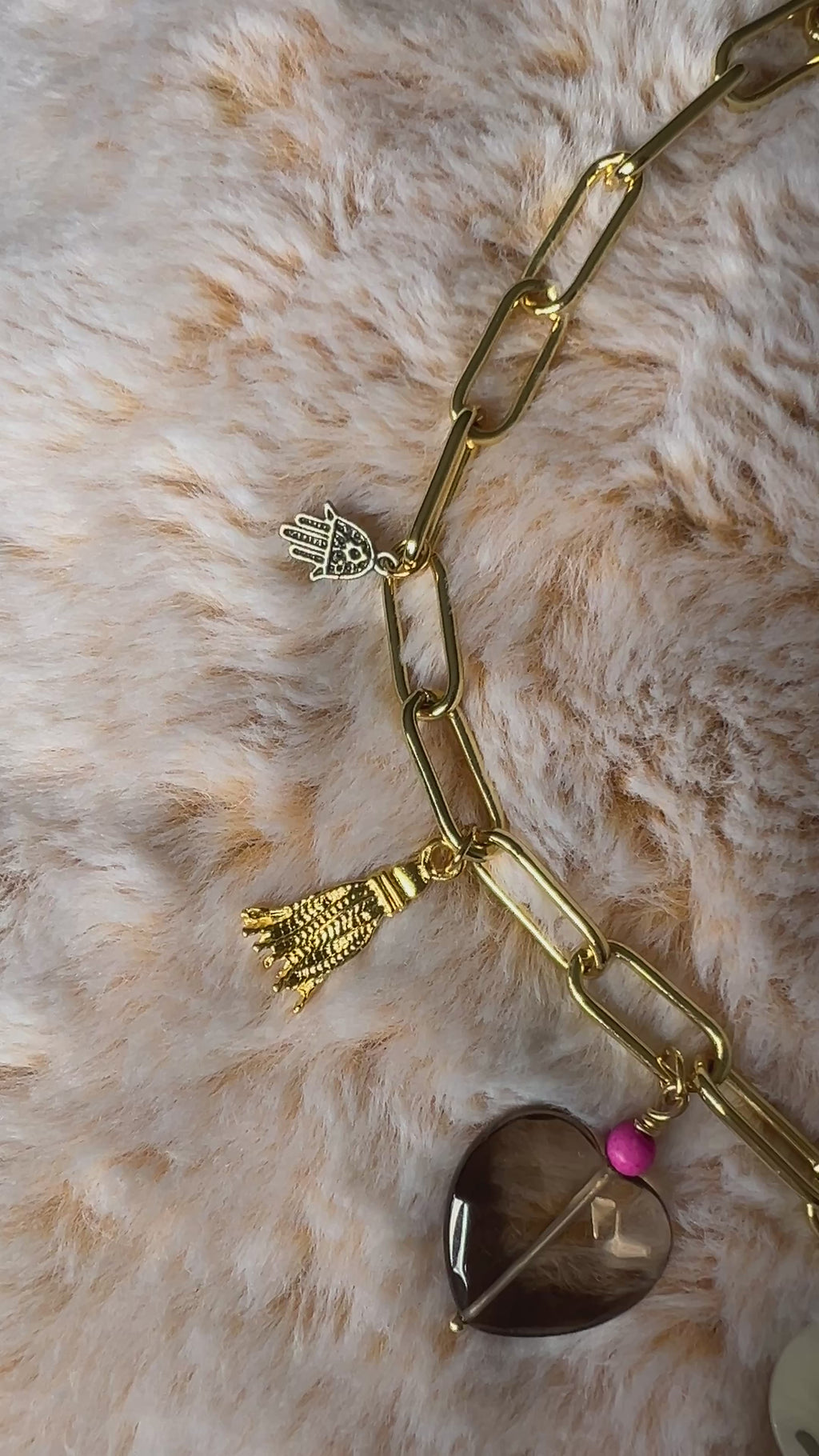 Unique charms collected from all around the world to include all. Gold paperclip charm necklace featuring a gold stainless steel heart pendant, a large smokey quartz faceted cut heart charm, pyrite or howlite or sodalite hamsa hand pendant plus vintage up-cycled Virgin Mary oval charms and other sweet trinkets. 3 necklaces vary in design